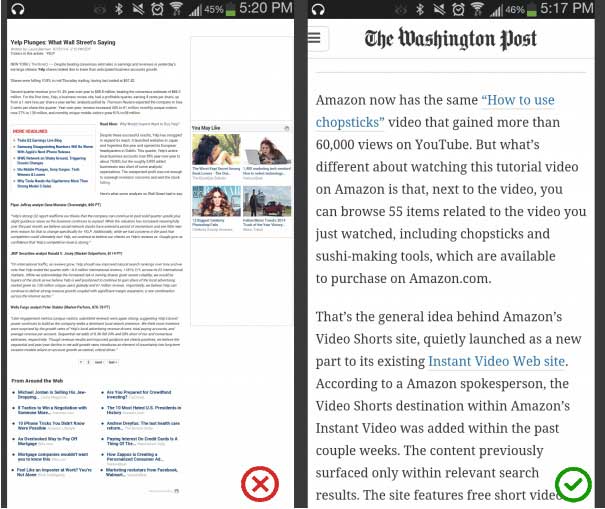 对于移动设备,您应该每行30- 40 个字符 。以下是在移动设备上查看的两个网站的示例。第一个使用每行50- 75 个字符(打印和桌面的每行最佳字符数),而第二个使用最佳30- 40 个字符。