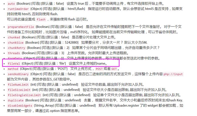 当我我给他接口不传参数的时候上传文件,他那里看到的tomcat日志打印出来了三个参数,分别是file,fileContentType,fileFileNamez这三个参数,file这个参数经过调试,是我传过去的文件,然后我们就猜测是不是有一个默认参数叫做“file”,去webuploader这个api中经过搜索证明了我们的猜测是正确的,如下图:
