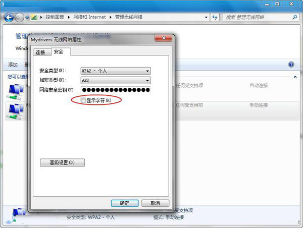 单击右下方的“无线网络连接”按钮,系统将会弹出其“属性”窗口。点击中间部分的“无线属性”按钮,即弹出界面。然后再点选“显示字符”项,就可以查看到对应的无线网络密码了。