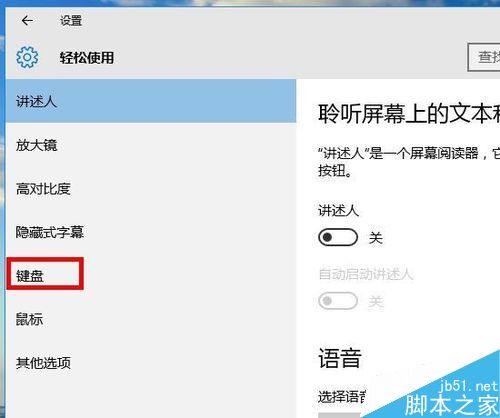 在设置界面左键选择“轻松使用”,然后在轻松使用设置界面鼠标左键选择“键盘”。