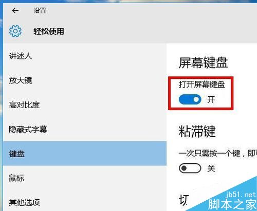 在键盘设置界面右侧把“打开屏幕键盘”的开关设置为“开”,屏幕键盘即显示在桌面上了。