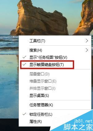 将鼠标放桌面下方的任务栏上点击右键,然后左键勾选“显示触摸键盘按钮”,随即在任务栏出现触摸键盘按钮图标。
