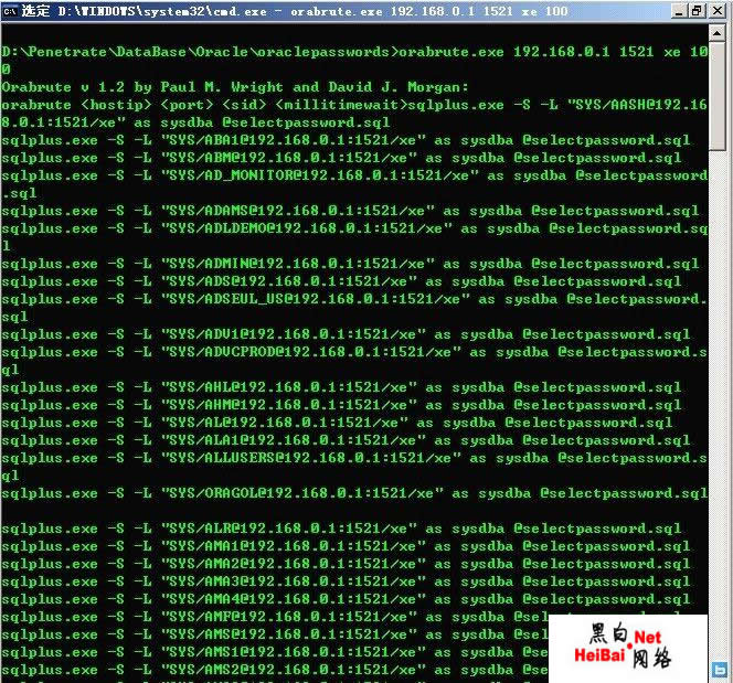 可以使用 Orabrute 工具来进行远程破解,在使用这个工具的时候,需要系统提前安装好 Sqlplus,该工具的 原理很简单,就是不停的调用 Sqlplus 然后进行登录验证,帐户选择的是 SYS,密码则为 password.txt 中的密 码单词。只要登录成功 ,就会调用 selectpassword.sql 脚本抓取出在 SYS.USER$表中的其他用户的哈希值 , 然后退出程序。这里有个注意的地方,当第二次运行 Orabrute 的时候,需要删除或移动同目录下的前一次运行 Orabrute 时生成的 thepasswordsarehere .txt 和 output.txt 文件。