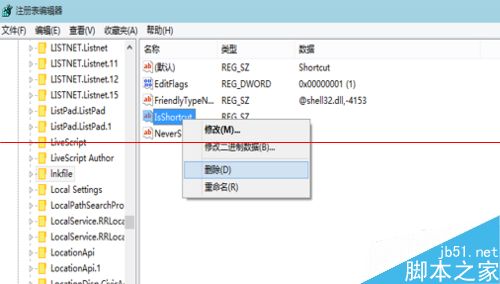 5、再在注册表编辑器右侧找到“IsShortcut”字符串值项,然后右键单击将其删除。