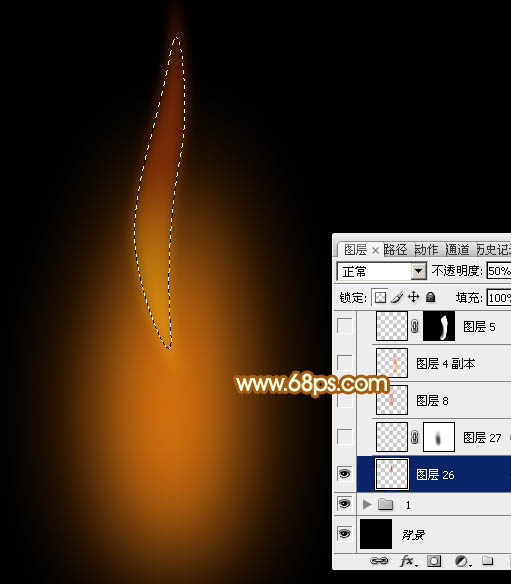 3、新建一个组,在组里新建一个图层,用钢笔勾出顶部的火焰轮廓,转为选区后羽化6个像素,然后填充暗红色#CF4809,底部用减淡工具稍微涂亮一点,确定后把图层不透明度改为:50%,如下图。