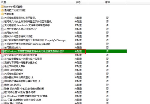 3、在右侧的面板中,找到“在Windows资源管理器搜索框中关闭最近搜索条目的显示”项,然后在弹出的对话框中设置为“已启用”。然后保存设置退出组策略。