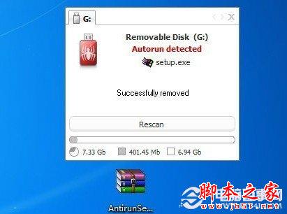 当U盘插入电脑时,Antirun就会自动扫描检测该U盘中是否有autorun.inf文件,一旦被侦测到就视为病毒出现删除信息,这时按下Delete按钮,就可将autorun文件删掉。当清除完毕后,界面就会出现“Successfully removed”信息(表示已成功删除,这时再按Rescan按钮,就可以正常使用U盘了。