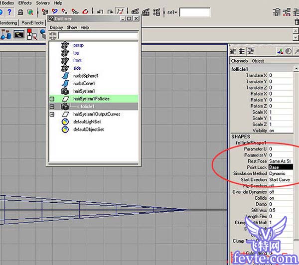 4.打开outline,选择hairsystem1 follicles下的folloicles,在通道栏中将point lock值改为base。