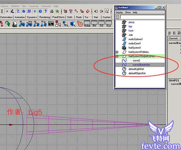 3.选择曲线,再将它转化为动力学曲线。hair---->make selectd curves dynamic。