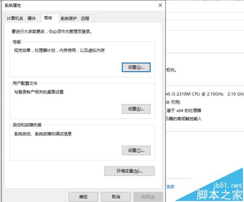 3、依次选择系统属性中的<高级>页,然后选择最上方的性能栏菜单右侧的<设置>按键
