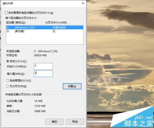 6、可以选择将虚拟内存从C盘设置为D盘,选择自定义C盘为0,D盘大小一般只要是内存的二分之一左右即可。