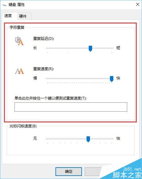 3、打开的键盘属性设置中,就可以看到键盘速度设置了,包括重复延迟、重复速度快慢等等,如果您打字速度足够快,可以将重复延迟时间设置的更短一些,这样有利于提升打字速率,随后点击确定即可。