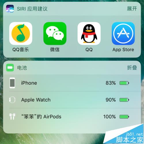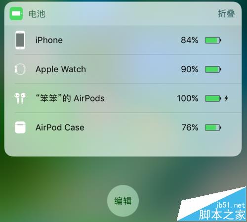 2、此外,在通知中心的今天功能栏目中,也能看到当前连接的 AirPods 蓝牙电量,如图所示。