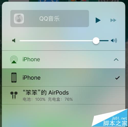 3、你还可以通过控制中心下方的音频设备,查看 AirPods 的电量,如图所示。
