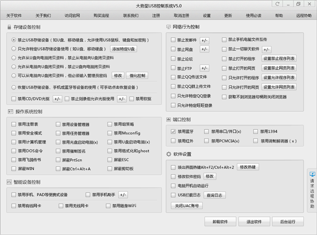部署专门的电脑USB接口禁用软件来禁止USB存储设备的使用。目前国内有很多专门的屏蔽USB存储设备的软件,例如有一款“大势至USB端口禁用软件”(下载地址:http://www.grabsun.com/monitorusb.html),只需要在电脑安装完毕之后,就自动禁止插入电脑的U盘、移动硬盘等USB存储设备,同时还不影响非USB存储设备的使用(如USB鼠标键盘)。同时,大势至USB端口禁用软件还可以禁止电脑发邮件、禁止网盘文件上传、禁止FTP文件上传以及禁止QQ发文件等,全面保护电脑文件安全,防止通过各种途径泄露的行为。如下图所示: