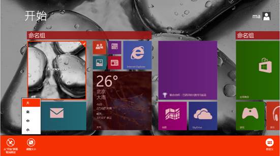 在Win8系统下,磁贴仅有两种大小:放大和缩小
