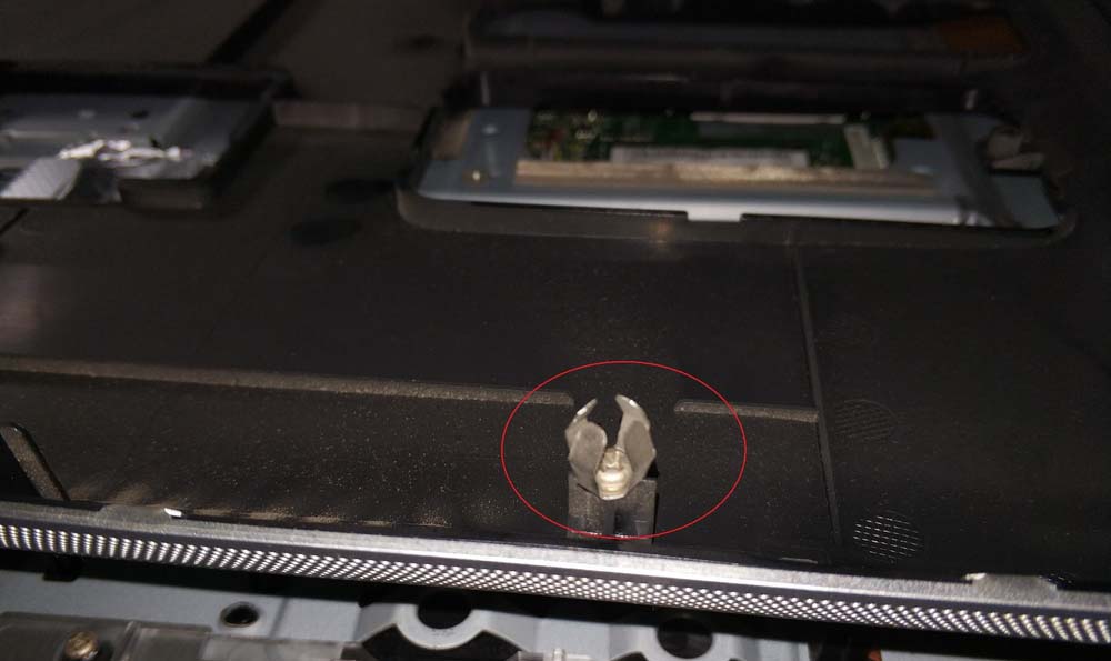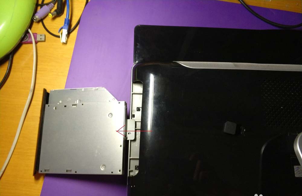 3、卸光驱。如果只是清灰,也可以不拆光驱,不影响拆后盖。若需拆光驱,将图中橡胶片扣开,卸掉螺丝,光驱就可以抽出,不好抽,使点劲就可以。