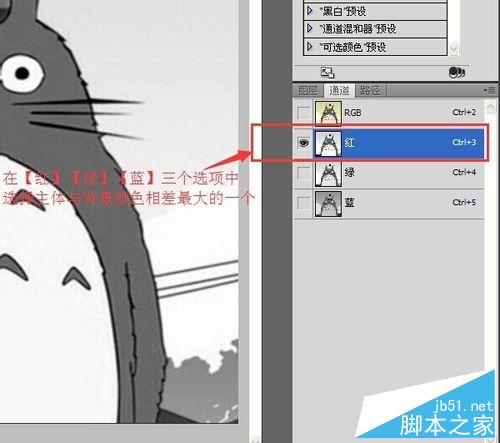 3、查看色差比。在【红】【绿】【蓝】三个通道中,选择主体与背景色差比最大的通道。