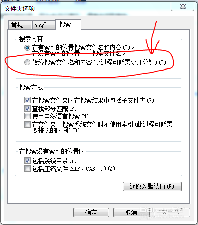 其二即是,如果想要搜索的不只是文件名,而是包括文件内容的话,则需在“组织——文件夹和搜索选项”中进行设置,如图。也可在此更改压缩包搜索选项