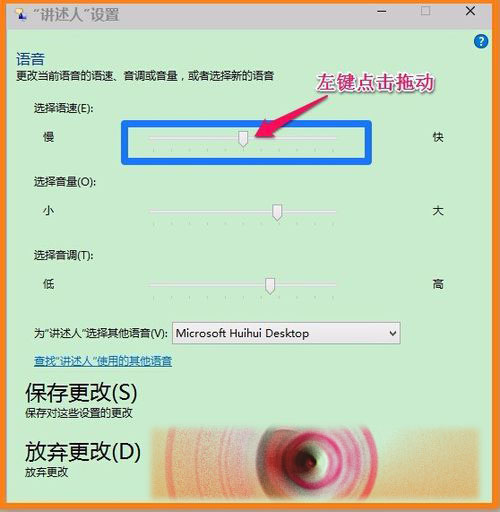 左键点击拖动选择音调(O)的小滑块可以调整“讲述人”的音调;