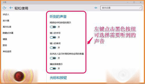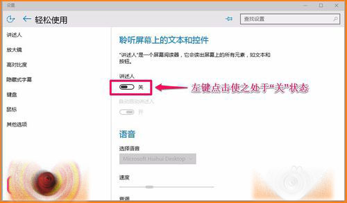 10、“讲述人”的不厌其烦的讲述,有时我们自己烦了,那就把他关掉好了,在“讲述人”对应的右侧窗口,左键点击使之处于“关”状态,“讲述人”就关闭了。