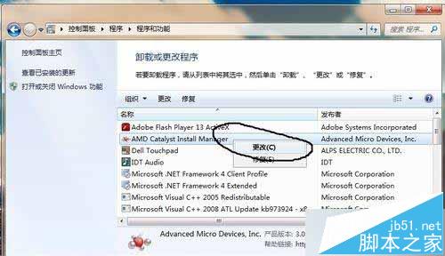 3、打开控制面板,找到已经安装的amd驱动程序,右击-更改,进入AMD显卡驱动安装程序;