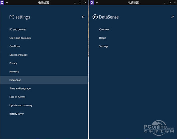 Build 9860新增加了一项Data Sense数据流量感知功能,位于“电脑设置”(PC settings)一级菜单下,分为Overview、Usage、Settings三项,功能是显示用户电脑的流量使用情况。