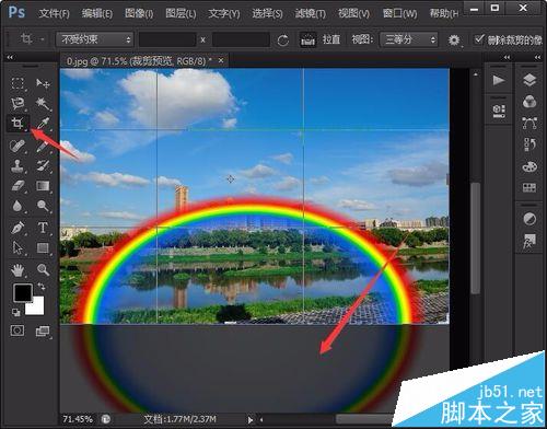 6、调整好以后,将彩虹圈移动到下侧,将一半放置在背景外,然后点击“裁剪工具”,将超出的一半裁剪掉,如图所示。