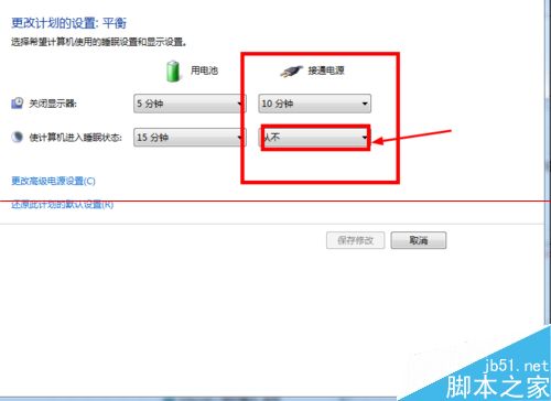 5、把接通电源【是计算机进入睡眠状态】改成【从不】。即可。光此一项就能节约1----2g硬盘资源。