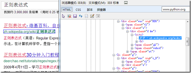 从上图可以看出我需要的站点在标签<cite></cite>中,所以我使用正则表达式提取这其中的文本是否就可以呢?