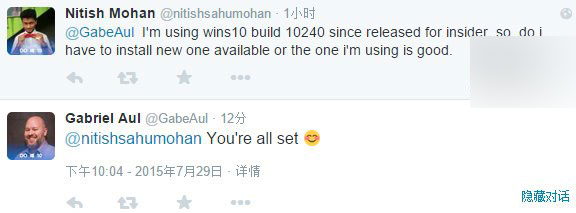 Gabriel Aul是在Twitter上回答用户提问时给出的上述结论。有Win10 Insider用户向他询问,对于已经升级到Build 10240版本的Win10,“是否有必要安装新的(7月29日)可用版本?或者维持现有版本。”这位负责人表示“你现在的版本已经全部搞定。”
