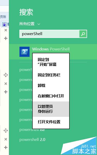 3、若您的机器出厂预装Windows8系统,鼠标放到右下角点击搜索,输入powershell,右击以管理员身份运行