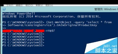 4、输入(Get-WmiObject -query ‘select * fromSoftwareLicensingService’).OA3xOriginalProductKey可以直接复制,复制后,直接在下面页面右键单击一次,就会复制到那里了,再按回车键,密钥出现了,如果不可以,重复复制一次再回车