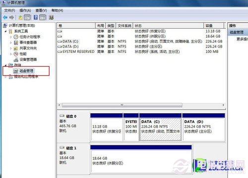 首先,鼠标右键点击计算机,然后选择管理,这样会进入计算机管理这个界面。Windows 7 系统中的管理应用已经相当智能化也高级化,各个系统级操作都能较好的运行。接下来,在计算机管理界面中点击进入磁盘管理,之后我们就能看到整个硬盘分区的详细情况。