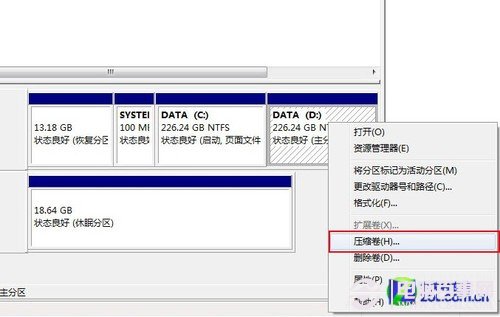 接着我们要为新系统腾出一些硬盘空间,如果已经有空闲分区就可以省去下面的步骤。选择一个空闲容量较多的分区,右键点击选择压缩卷,然后输入所需的容量大小,推荐容量选择 20GB 以上,及大于 20480 MB 的硬盘空间。(注意:尽量不要选择系统分区)