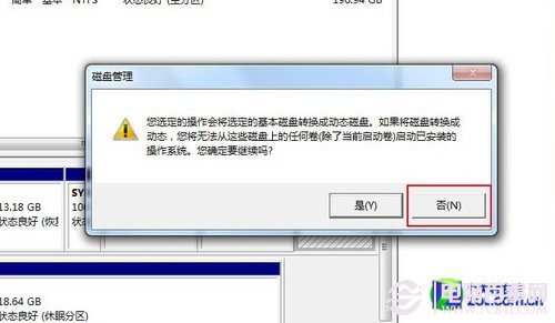 需要注意的是,如果在最后一个新建分区时出现这个对话框提示,一定要选择否,不然你的硬盘就悲剧了。解决方法是利用硬盘管理软件将这个分区转换为逻辑分区,这样就不会出现基本磁盘转换成动态磁盘的提示。切记,动态磁盘不适于一般用户使用,请勿转换!