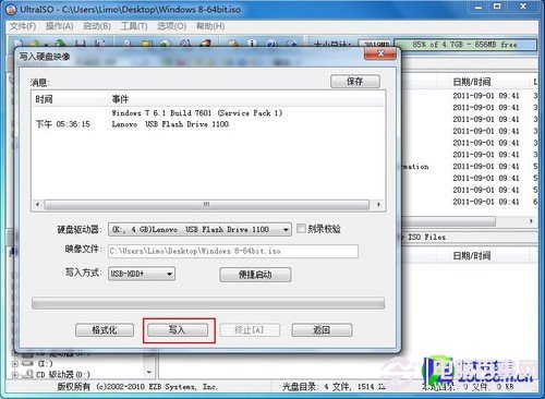 进入刻录界面后,在硬盘驱动器部分选择可写入的 U 盘盘符,确认无误后点击写入,等待一段时间即可。