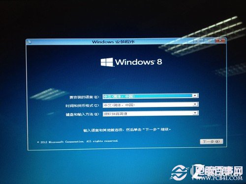 Windows 8 消费者预览版提供了简体中文,所以在最开始的部分我们选择默认无语即可(简体中文),然后点击下一步准备安装系统。