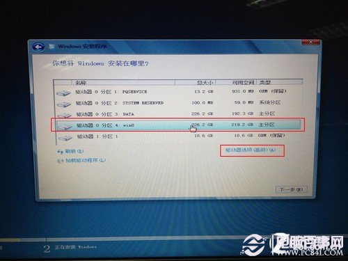 进入自定义安装模式后,我们会看到硬盘分区列表,选择先前准备好的新分区来安装系统。(如果是要重新安装系统,就选择原有系统的分区,点击驱动器选项——格式化,待格式化完成后选择分区,下一步继续安装。)