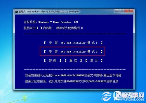 接着我们打开 nt6 hdd installer 这个工具,会显示一个界面,提示选择安装两种引导模式。如果原有系统不是 Windows 7 或在这版本之前(如 XP)请选择模式 1,如果是 Windows 7 操作系统就选择模式 2,这两种模式的引导方式不同切记别选错了。