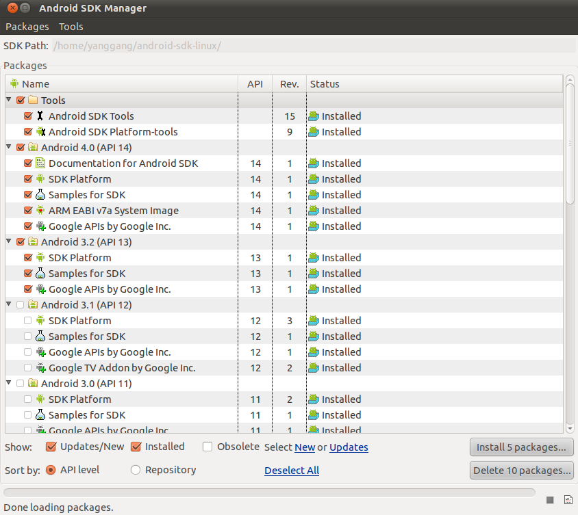 解压SDK: tar zxvf android-sdk_r15-linux.tgz