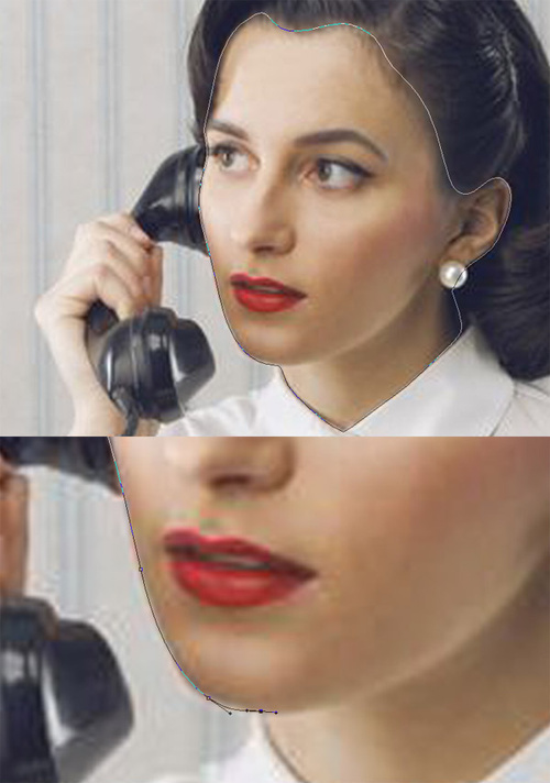 1、在Photoshop打开教程素材。60年代的利希滕斯坦波普艺术是今天的创意主题,因此需要注意将照片修剪一下,然后照片看起来就像人物面部特写一样。在工具栏中选择移动工具,然后在图中女士脸庞的周围建立选区,选区中要包含她拎起电话的部分,以便后续创作。