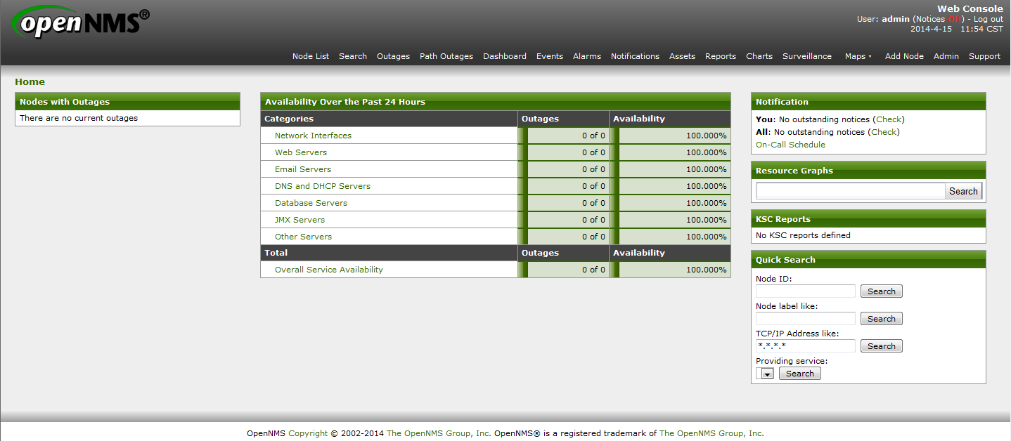 当服务或是节点,已经登记后;若发生节点关机、当机,或服务已经停止,OPENNMS会将其登记为损耗。此时,管理人员可已经由此界面查询,哪一些服务或主机现在是挂点的;或是曾经挂点,此功能可帮助管理维护。
