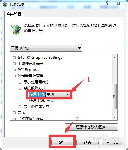 3、在电源选项对话框中,更改处理器电源管理中的系统散热方式把使用电源设置为主动,点击确定保证退出