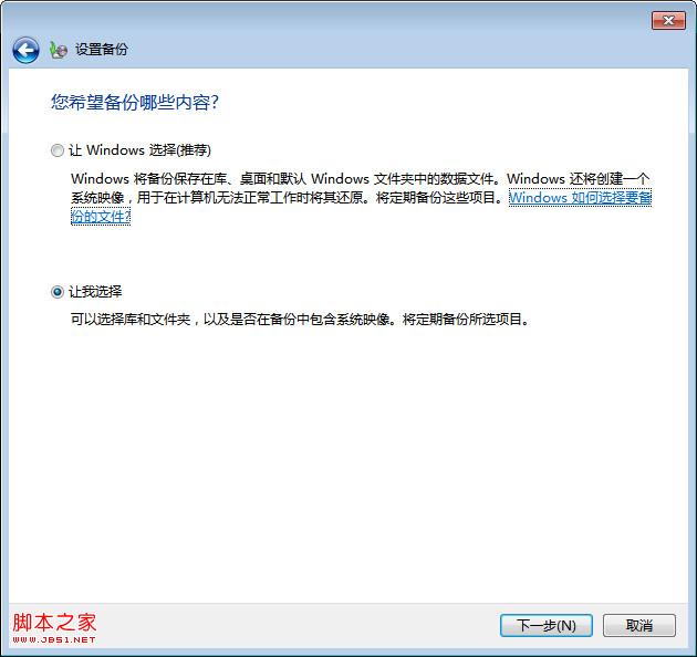 这里的有两个选项,分别是“让Windows选择”和“让我选择“:让Windows选择——Windows选择则只会备份自己的东西(包括一个系统盘映像),还有库、桌面等,如果库是出于网络驱动器上,将不会被备份。还有不备份的,比如FAT文件系统分区下的文件、回收站中的文 件以及小于1G驱动器下的临时文件等。让我选择——可以手动配置Windows 7的计划备份具体内容,如下图,实际上也是让Windows选择的默认内容。