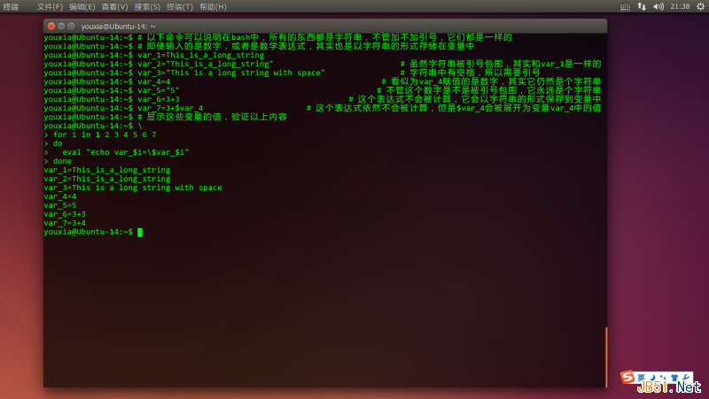 上图是我在交互式的Bash命令行中做的一些演示。在上图中,我对变量分别赋值,不管等号右边是一个没有引号的字符串,还是带有引号的字符串,甚至数字,或者数学表达式,最终的结果,变量里面存储的都是字符串。我使用一个for循环显示所有的变量,可以看到数学表达式也只是以字符串的形式储存,没有被求值。