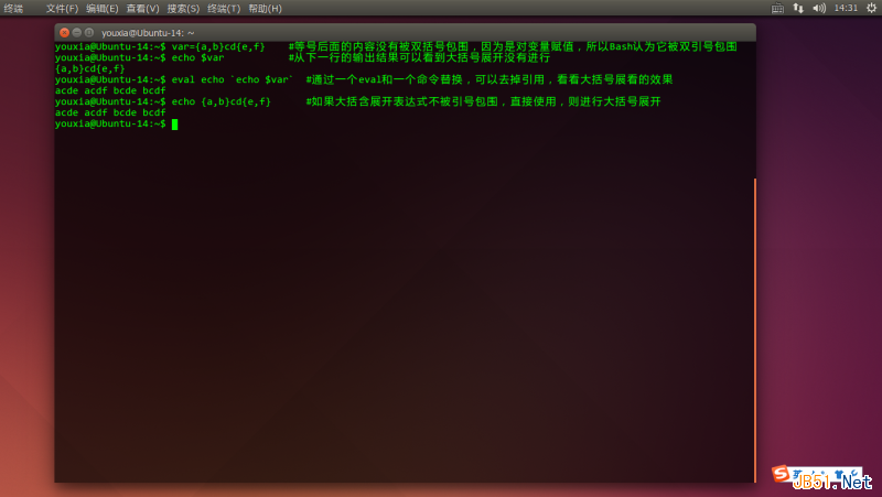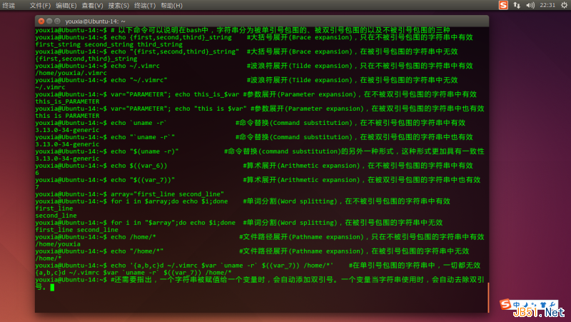 10.以上流程全部完成后,最后去掉字符串外面的引号(如果有的话)。以上流程只按以上顺序进行一遍。比如不会在变量展开后再进行大括号展开,更不会在第10步去除引用后执行前面的任何一步。如果需要将流程再走一遍,请使用eval。