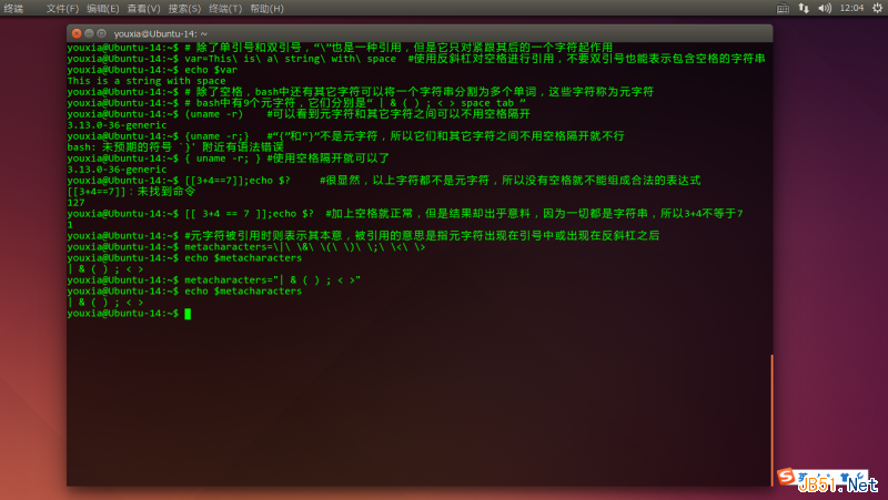 最常见的元字符就是空格。 从上面几张图片可以看出,如果要将一个含有空格的字符串赋值给一个变量,要么把这个字符串用双引号包围,要么使用“\”对空格进行引用。 从上图中可以看出,Bash中只有9个元字符,它们分别是“| & ( ) ; < > space tab”,而在其它编程语言中经常出现的元字符“. { } [ ]”以及作为数学运算的加减乘除,在Bash中都不是元字符。