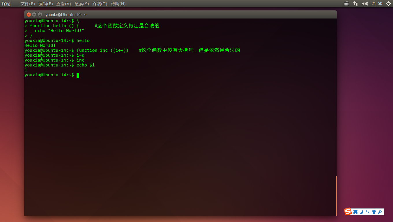 可以看出,如果有function关键字,则“()”是可选的,如果没有function关键字,则“()”是必须的。这里需要特别指出的是:函数体只要求是compound-command,我前面总结过compound-command有四种形式,所以有时候定义一个函数并不会出现“{ }”哦。如下图,这样的函数也是合法的: