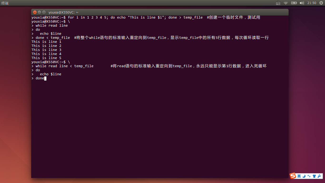 除了exec,输入输出重定向和read命令配合也很好用,read命令每次读取文件的一行。但是要注意的是,输入输出重定向放到for、while等循环的循环体和循环外,效果是不一样的。如下图: